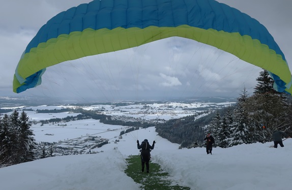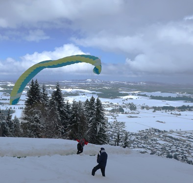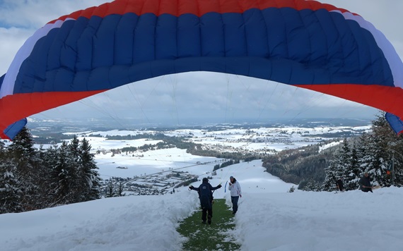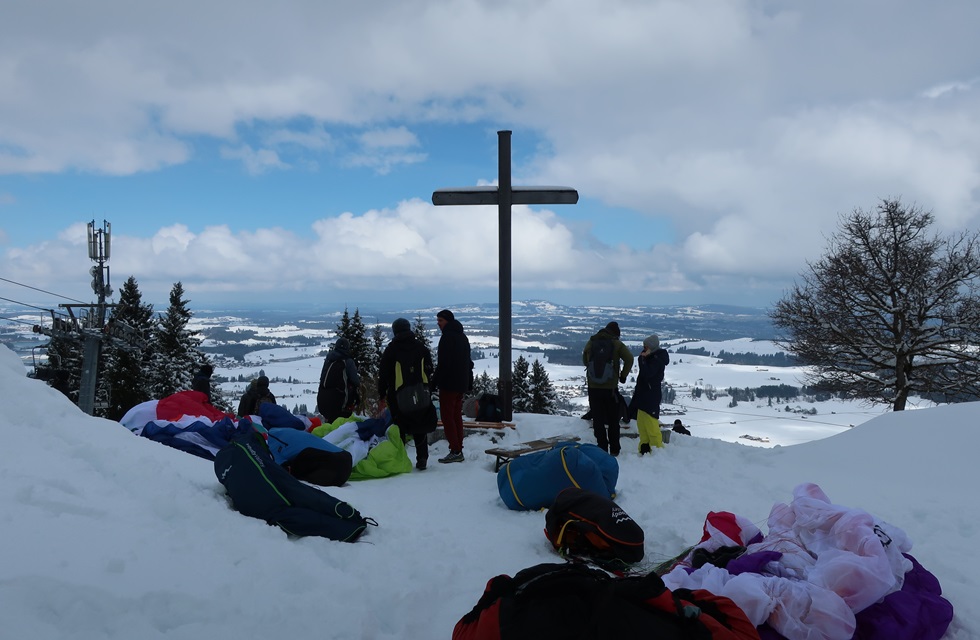 fleißige Schaufler am Flachstart. Als ich gegen zwölf eintreffe, ist der Berg frei und es fliegen Schüler.