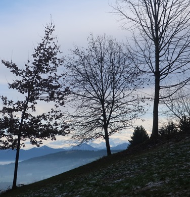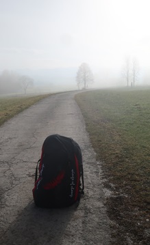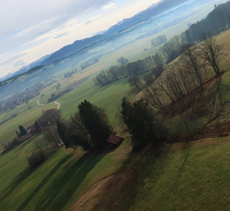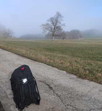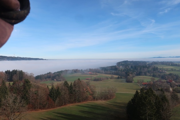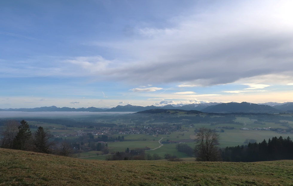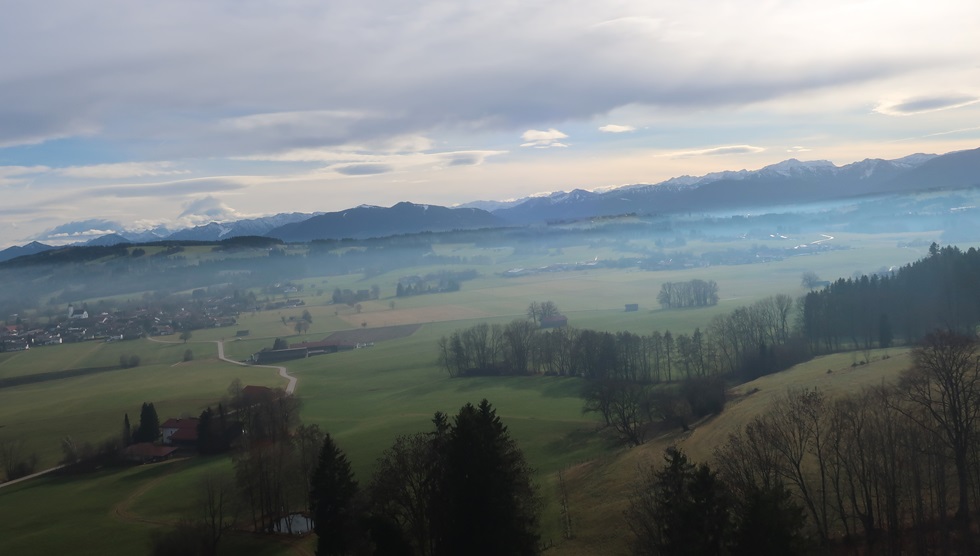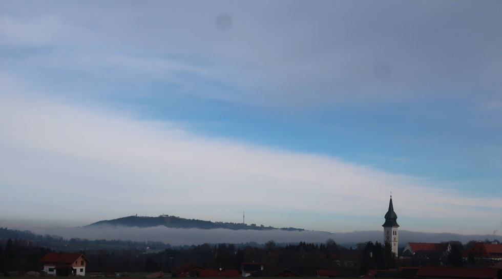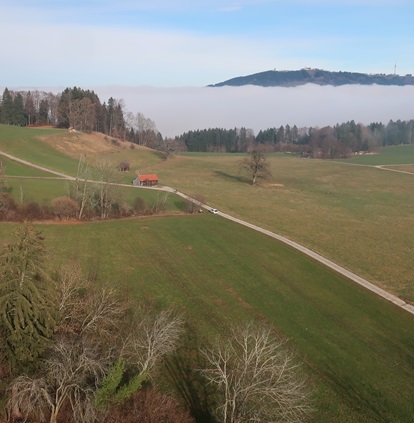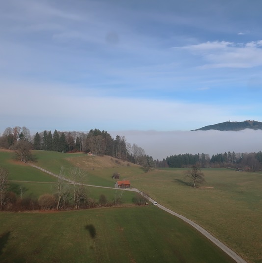 Kurz vor Rottenbuch sehe ich die Nebelbank vor dem Hohen Peißenberg.