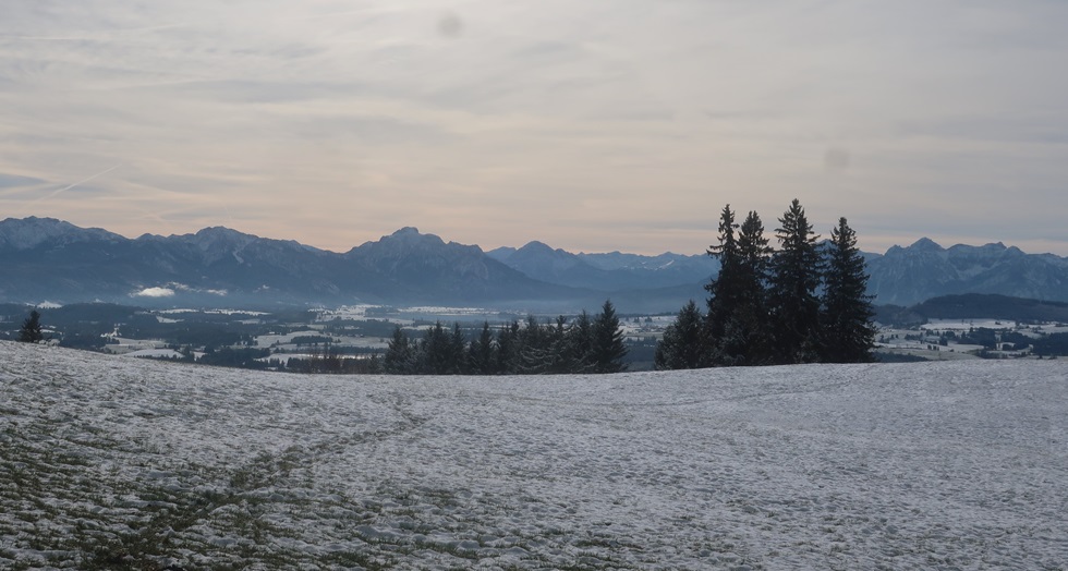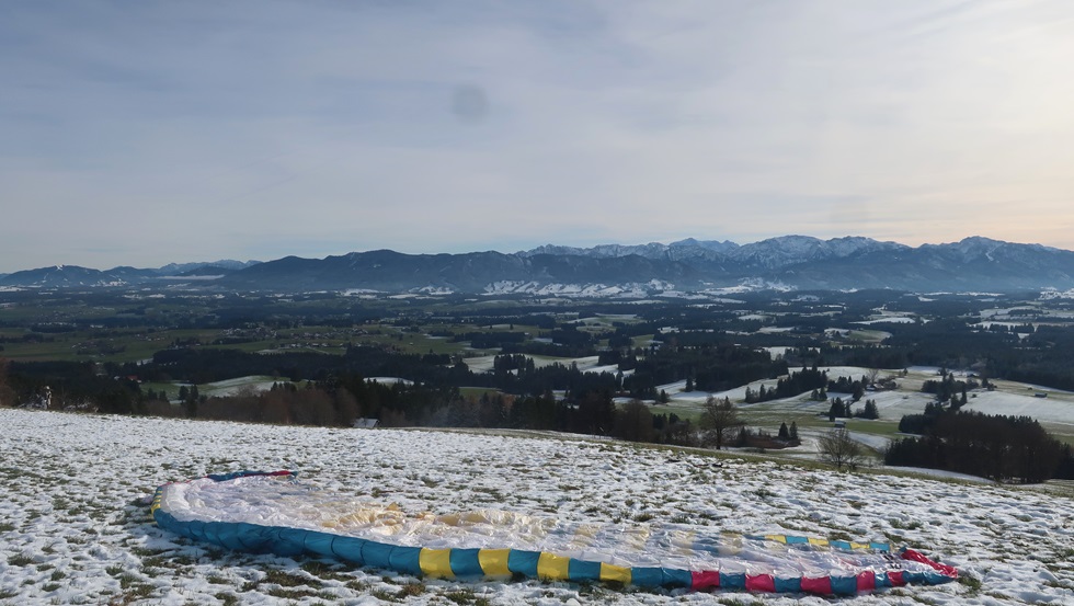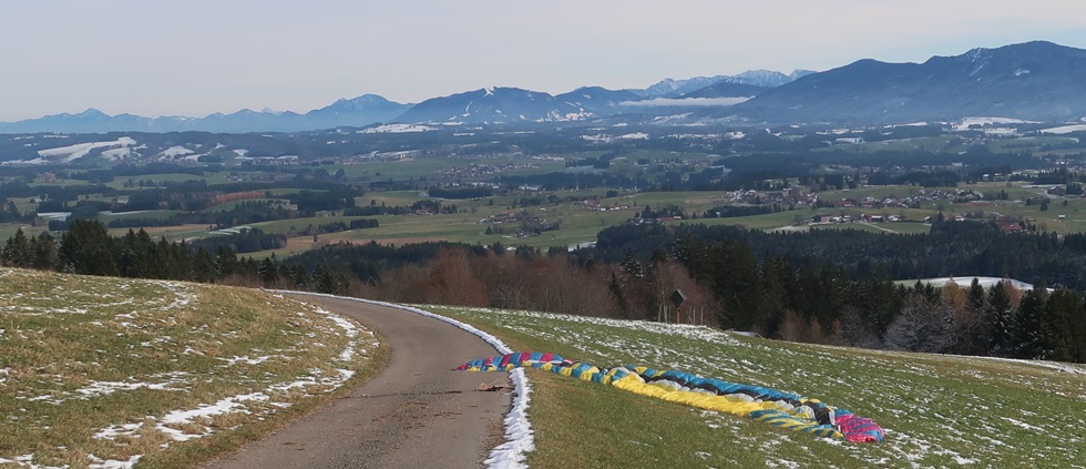 am Auerberg fliegen. Am Parkplatz beim Maibaum ist Windstille. Ich gehe ohne Sack.