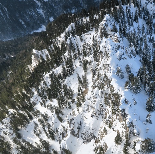 Ich erkenne unten einen gepflegten Winterlandeplatz, unter-