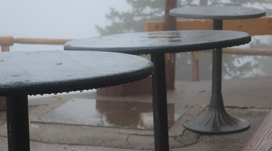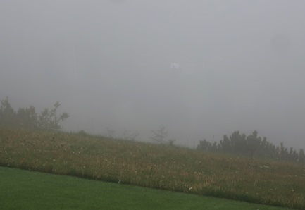 Morgens ist es trocken, die Wolken hängen tief. Der Buchenberg meldet Fahrbetrieb