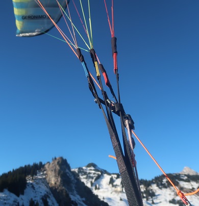 hängen, hebe eingewistet ab, drehe mich aus und fliege nach links auf die