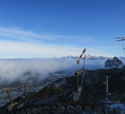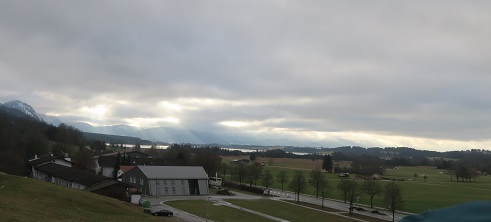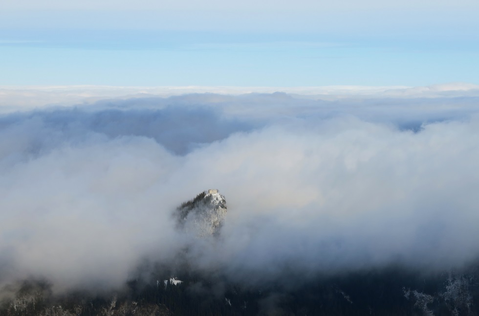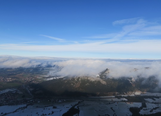 Inzwischen ist im Alpenvorland alles tief verhangen. Der Tegelberg ragt über die Wolken,