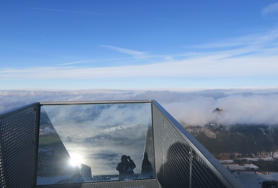 Während des Hochfahrens beginnt sich der Gipfel zu verhüllen. Oben sehe ich noch run-