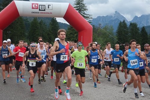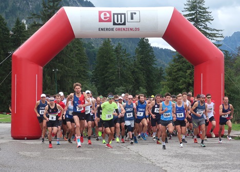 Unten startet - nach einer Gedenkminute für Laura Dahlmeier - der alljährliche Berglauf hoch zur