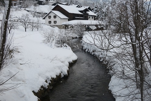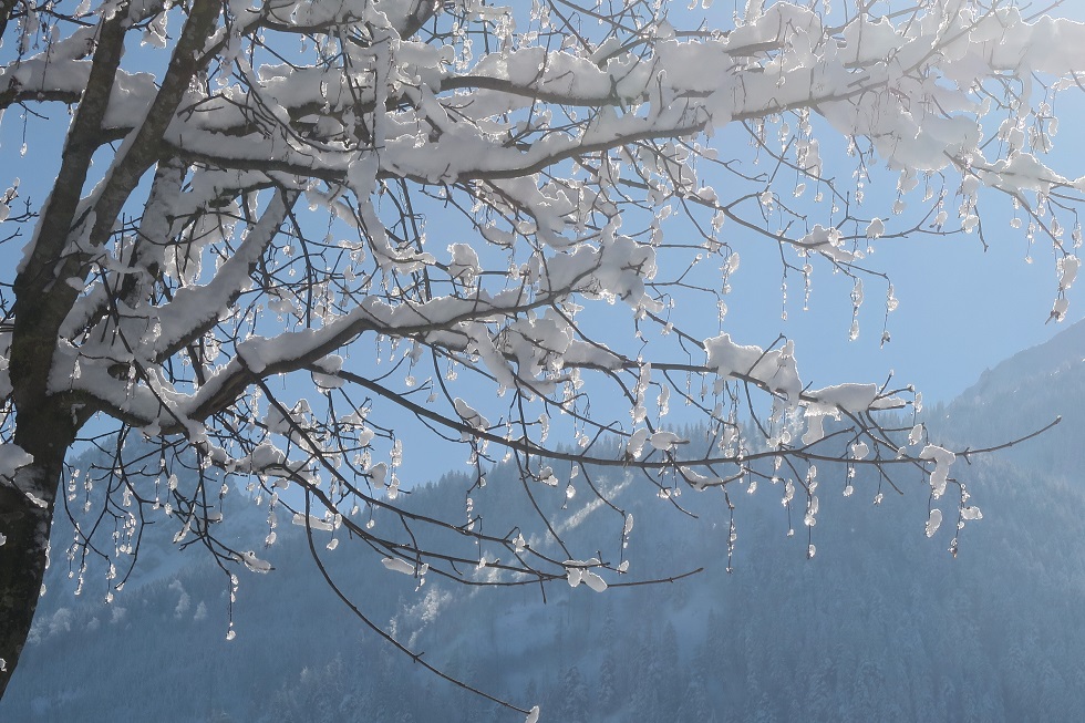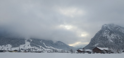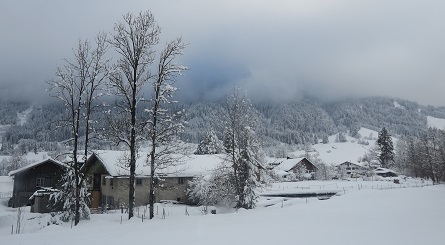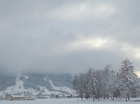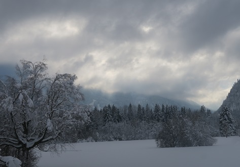 das Bad verlasse, sind die Berge alle verhüllt.