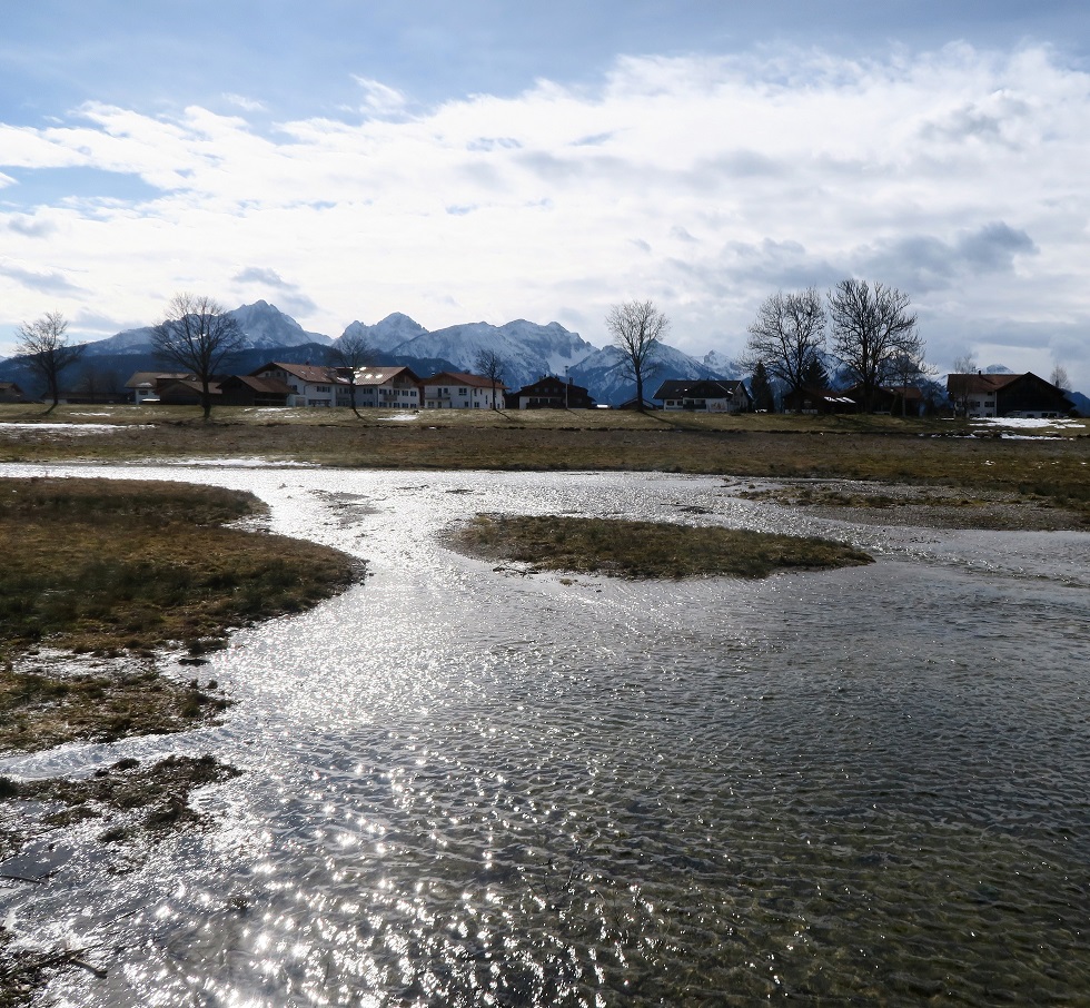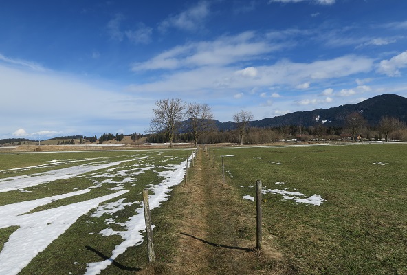 Die erste Zeit wandere ich bei Brunnen ins Forggenseebett.