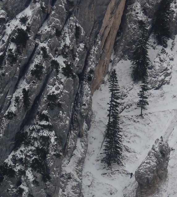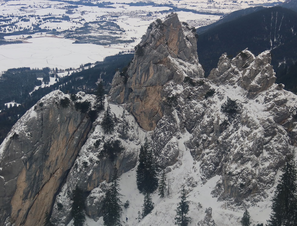Am Unterrand des rechten Bildes ein Wanderer im Aufstieg nahe dem Gelbe-Wand-Weg.