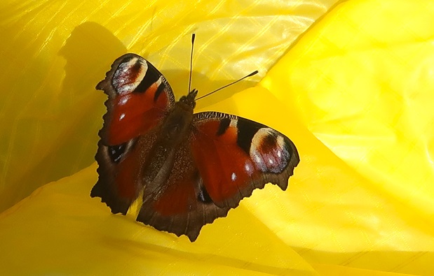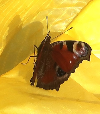 Das Pfauenauge sitzt beim Einpacken auf meinem Schirm.