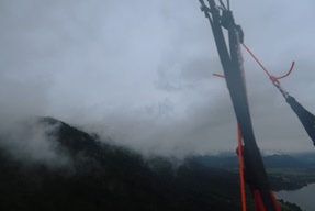 einen ausgelegten Gleitschirm. Ich rufe an, die Sesselbahn fährt!