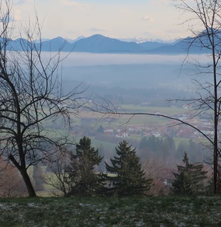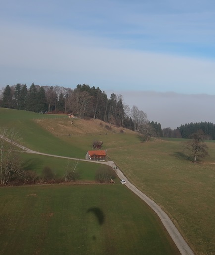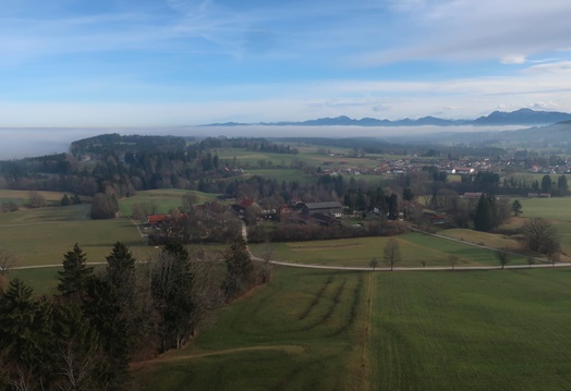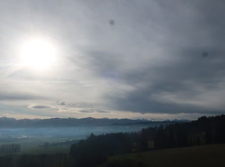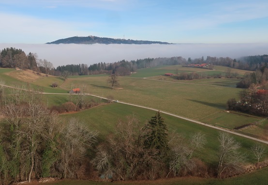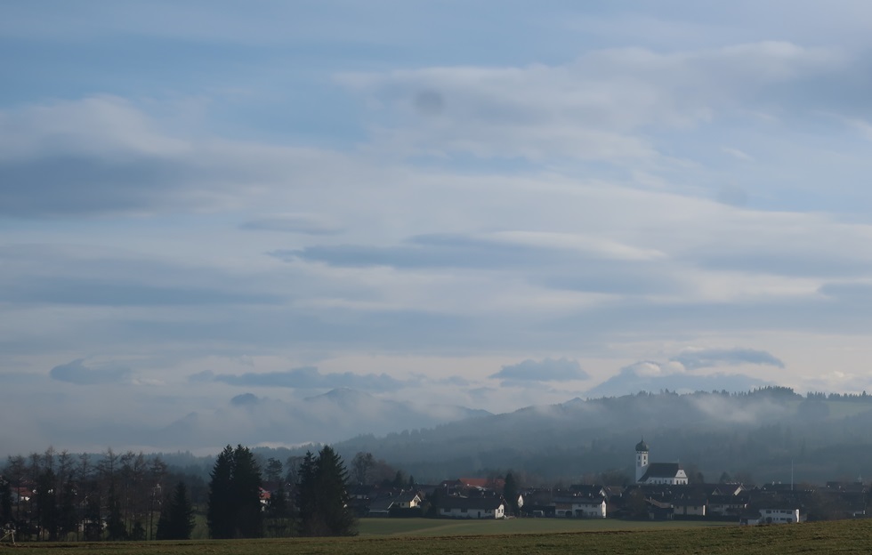 Kurz vor Rottenbuch sehe ich die Nebelbank vor dem Hohen Peißenberg.