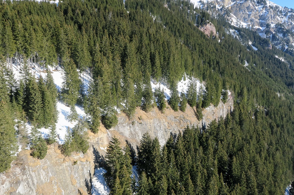 Ich ziele auf den sonnenbeschienenen Gegenhang oberhalb Halden-