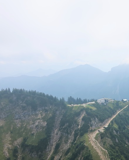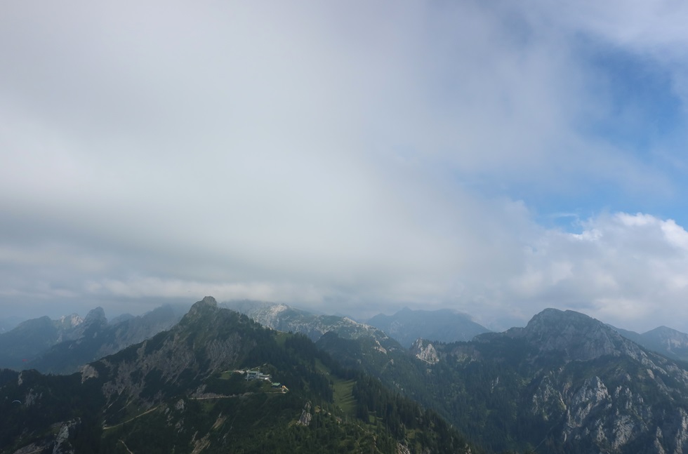 der Berg im Nebel. Bis ich durch die längere Gondelschlange durch bin, ist er frei. Oben suche