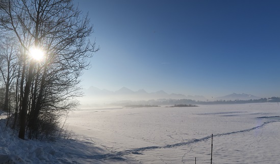 Das Alpenvorland steckt im Nebel. Der Tegelberg schaut auf eine geschlos-