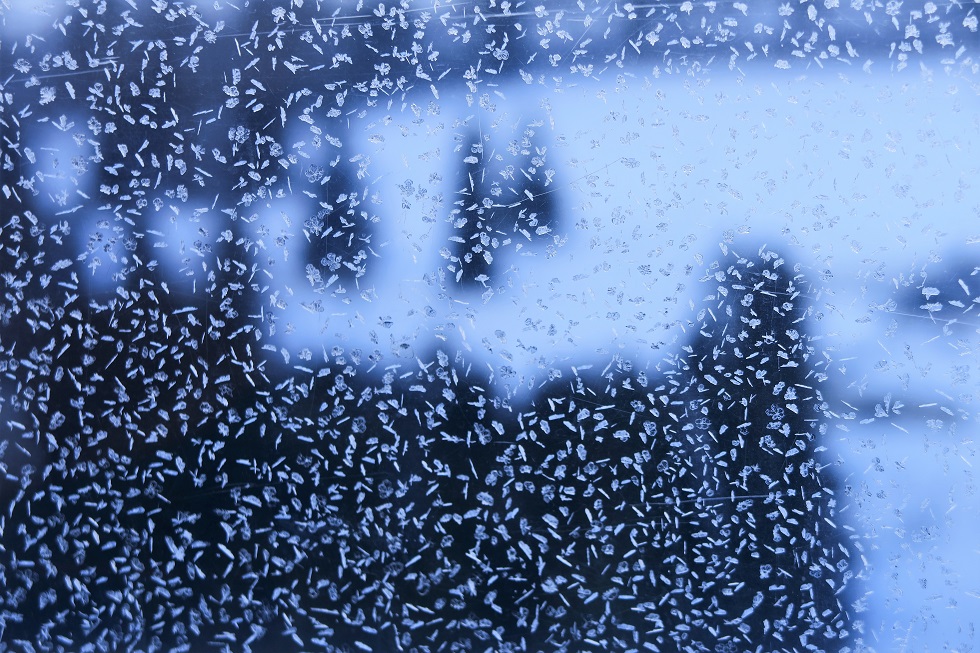 Das Eismuster ziert die Gondel. Das Dunkle ist der Wald.