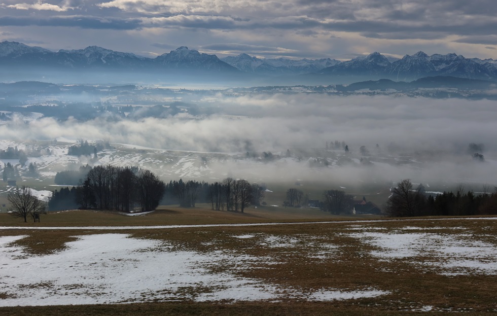 Von Westen kommt der Nebel. Schon in Stötten bin ich dick drin.