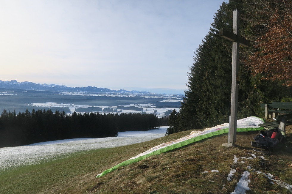 Wind von hinten! Also doch Auerberg. Dort oben stehen die Fahnen Südost. Der Wind