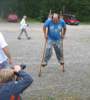 Bei Regen beginnen wir mit Stelzenlaufen, eine fürchterliche Schinderei.